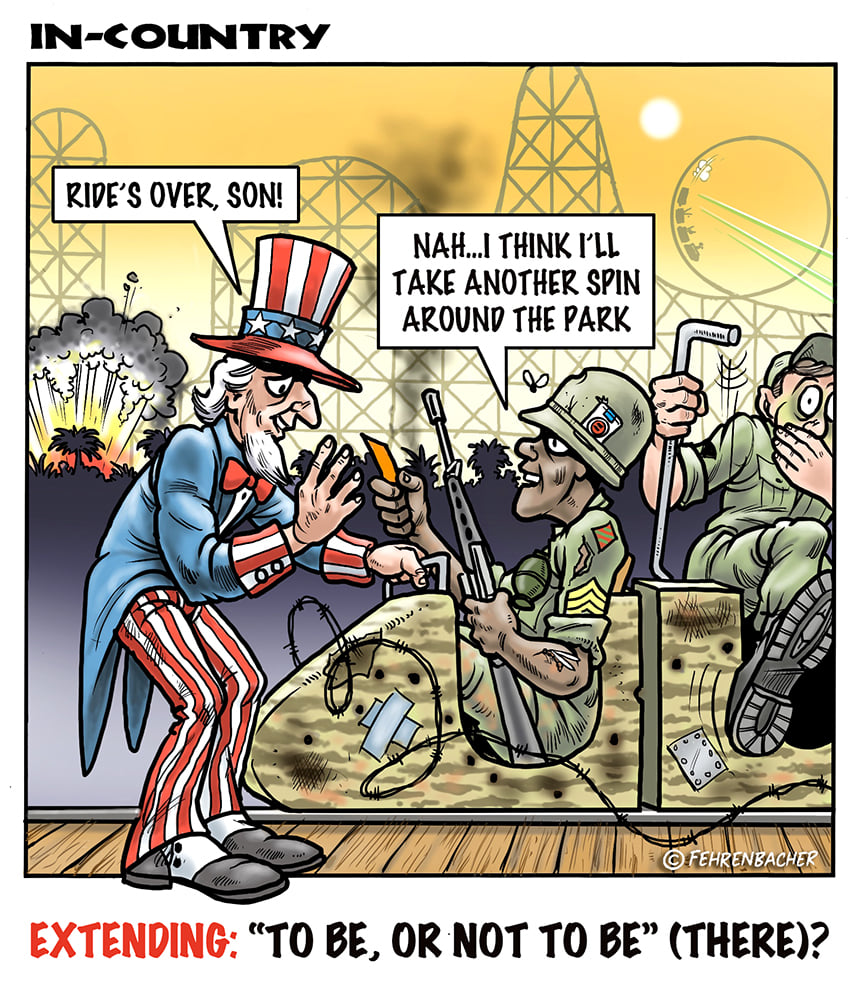Phil enlisted in the Army in 1965 where you served for years in Vietnam. He became a graphic designer and has worked for the state of Oregon for 26 years. He retired in 2003 and started the Cartoon "In-Country". The cartoons reflect his experiences during his tour of duty in South Vietnam.